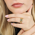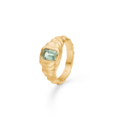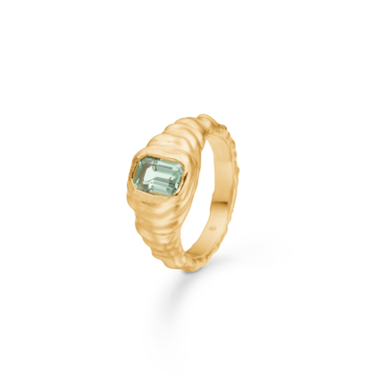 Designet er inspireret af istappers bølgede teksturer. Ringskinnen har en rå, poleret overflade, der omfavner en facetteret lysegrøn kubisk zirkonia, som tilfører et diskret farvespil til din hånd.