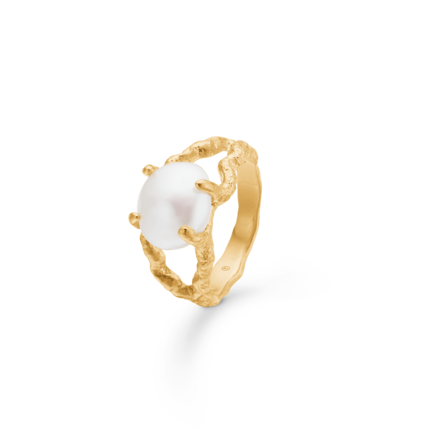 Designet er inspireret af klare vintermorgener. Perlen symboliserer sneen og er sat i en rå ringskinne med tekstur, der giver et feminint og kontrastfuldt udtryk.